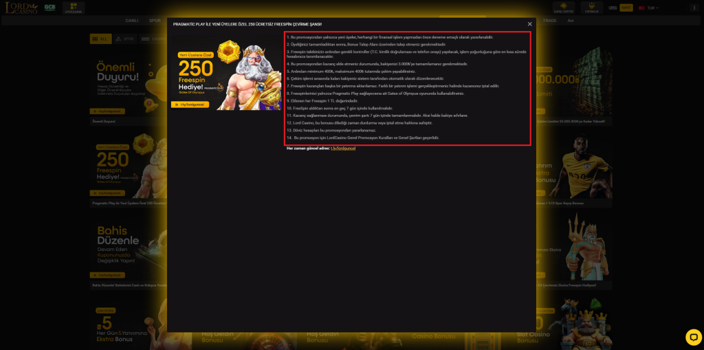 Lordcasino sanal bahis ile artık para kazanmak çok kolay! Lordcasino üzerinden gerçekleştireceğiniz sanal bahislerde ekstra freespinler ile şans oranınızı arttırabilirsiniz. Hızlı çekim ve yatırma seçenekleri ile bahis severlerin bir numaralı tercihi olmaya devam ediyoruz. Yüksek limitli transferler ile anlık işlem sağlamanın yanı sıra, altyapısını kendi ekibimizin oluşturduğu platformumuz ile ekstra güvenlik ve hızlı bahis ile donmadan aksaklık yaşamadan bahislerinizi gerçekleştirebilirsiniz. Sanal bahis dünyasında lisanlı bir şekilde faaliyetlerini sürdüren sayılı firma içerisinde bulunmaktan mutluluk duyuyoruz. Bu mutluluğumuzu bahis severler ile paylaşmak için yeni bir bonus sistemi ile karşınızdayız. Lordcasino Pragmatic Play ile Yeni Üyelere 250 Ücretsiz Freespin Çevirme Şansı bonusu ile ücretsiz freespin kazanma şansını sizlerde elde edebilirsiniz. Uyulması gereken kurallar ve şartlar ile ücretsiz freespinleriniz ile para kazanma şansını yakalamak için yapılması gerekenler;
