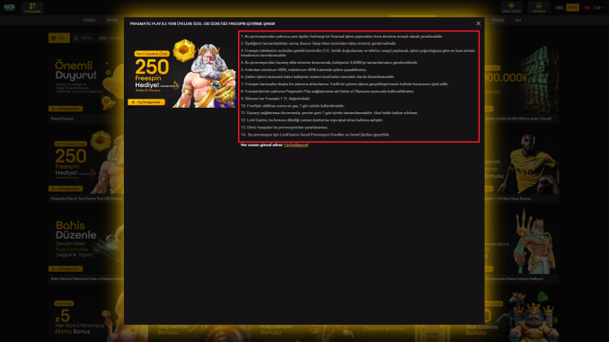 Lordcasino sanal bahis ile artık para kazanmak çok kolay! Lordcasino üzerinden gerçekleştireceğiniz sanal bahislerde ekstra freespinler ile şans oranınızı arttırabilirsiniz. Hızlı çekim ve yatırma seçenekleri ile bahis severlerin bir numaralı tercihi olmaya devam ediyoruz. Yüksek limitli transferler ile anlık işlem sağlamanın yanı sıra, altyapısını kendi ekibimizin oluşturduğu platformumuz ile ekstra güvenlik ve hızlı bahis ile donmadan aksaklık yaşamadan bahislerinizi gerçekleştirebilirsiniz. Sanal bahis dünyasında lisanlı bir şekilde faaliyetlerini sürdüren sayılı firma içerisinde bulunmaktan mutluluk duyuyoruz. Bu mutluluğumuzu bahis severler ile paylaşmak için yeni bir bonus sistemi ile karşınızdayız. Lordcasino Pragmatic Play ile Yeni Üyelere 250 Ücretsiz Freespin Çevirme Şansı bonusu ile ücretsiz freespin kazanma şansını sizlerde elde edebilirsiniz. Uyulması gereken kurallar ve şartlar ile ücretsiz freespinleriniz ile para kazanma şansını yakalamak için yapılması gerekenler;